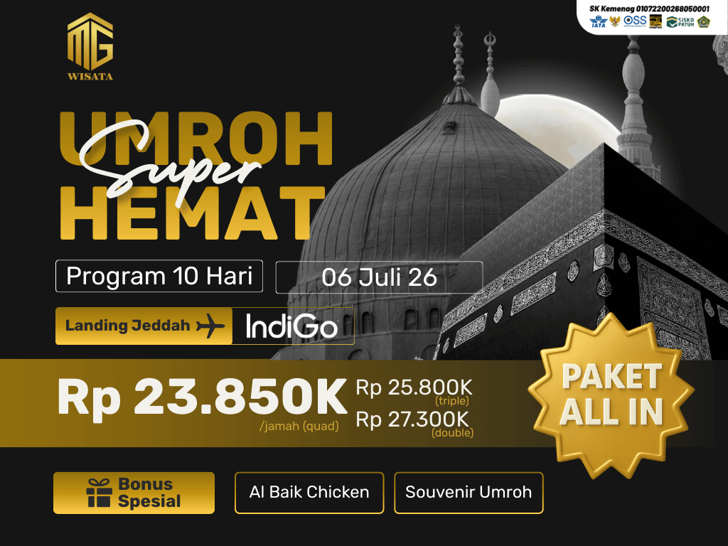 - Perlengkapan : Koper kabin, koper bagasi, tas paspor, kain ihram/mukena, sandal, buku manasik, kain seragam, syal, & sabuk
